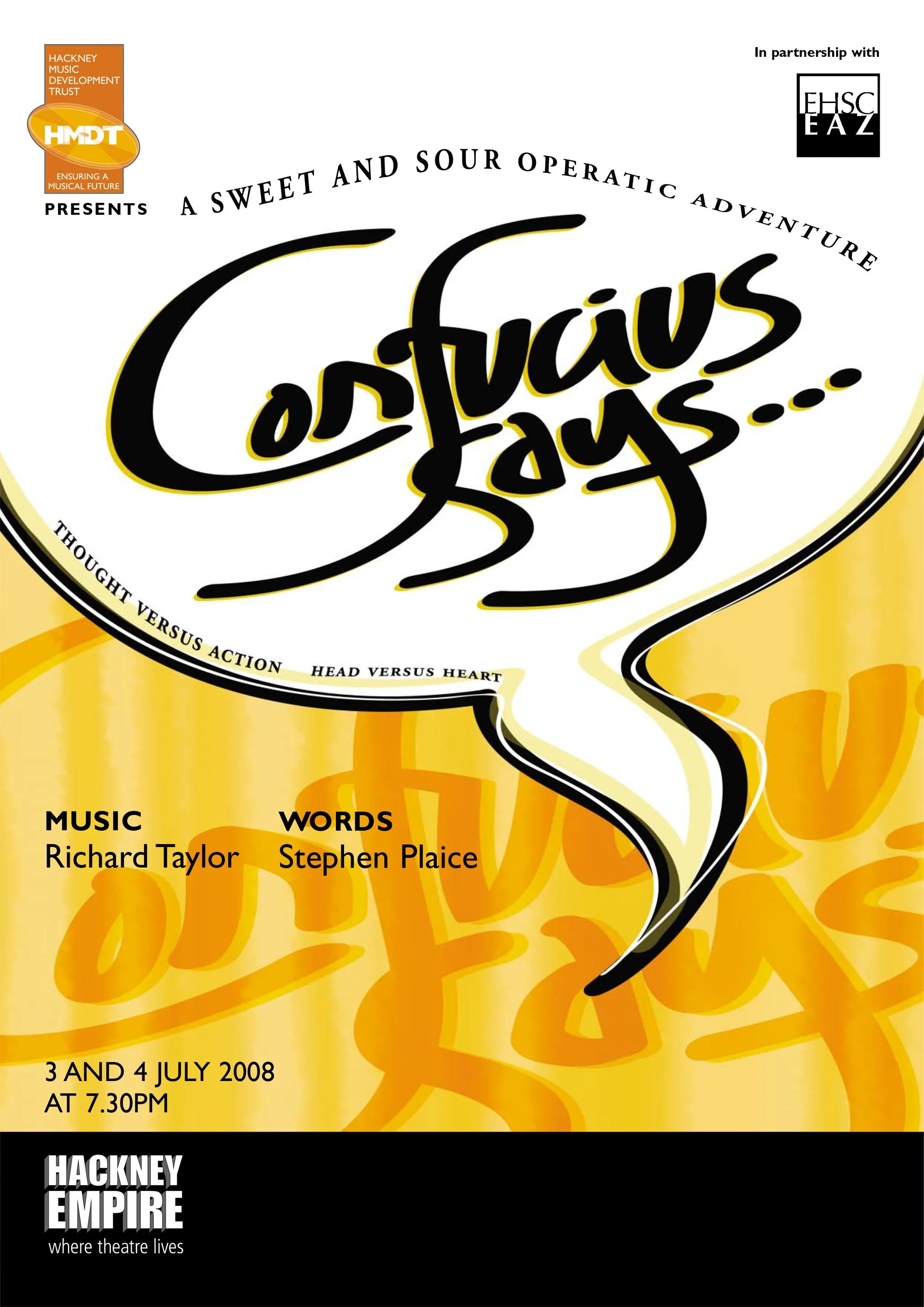 In May 2007, nine schools from the East Hackney Consortium Education Action Zone commissioned HMDT Music was commissioned to create a piece of work celebrating the cultural richness of China to celebrate the upcoming Beijing Olympic Games. The result was Confucius Says, a large-scale programme which engaged over 3500 students, staff and artists in both cross-curricular work and a range of creative activities culminating in a spectacular new opera performed by a cast of 350 at the Hackney Empire in July 2008.