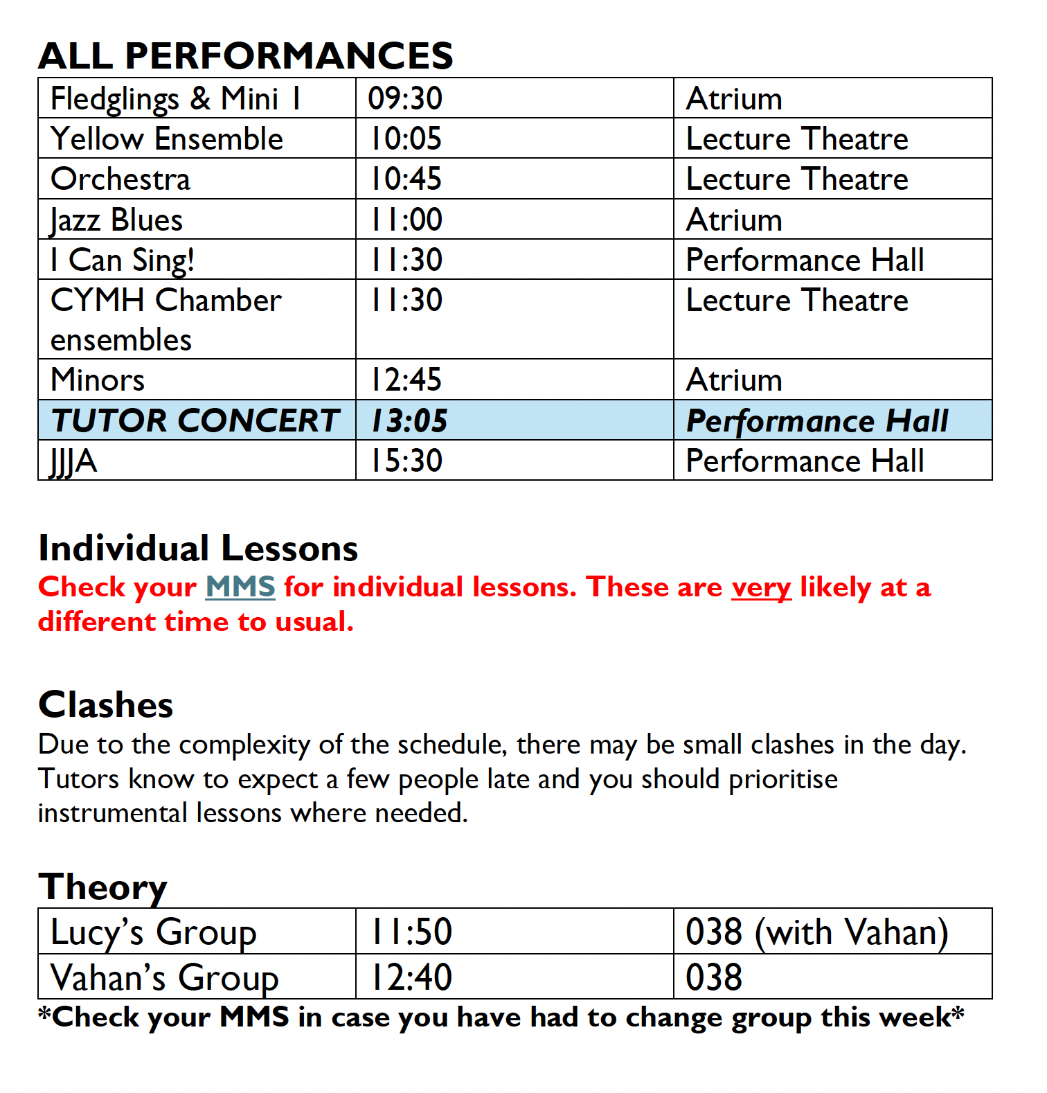 Below is a summary of group rehearsal and performance times. Please do let us know if there are any issues with individual lessons by 10am on 3rd March. Due to the complexity of the day we may not be able to take individual circumstances into account - however we will have a look and see what is possible.